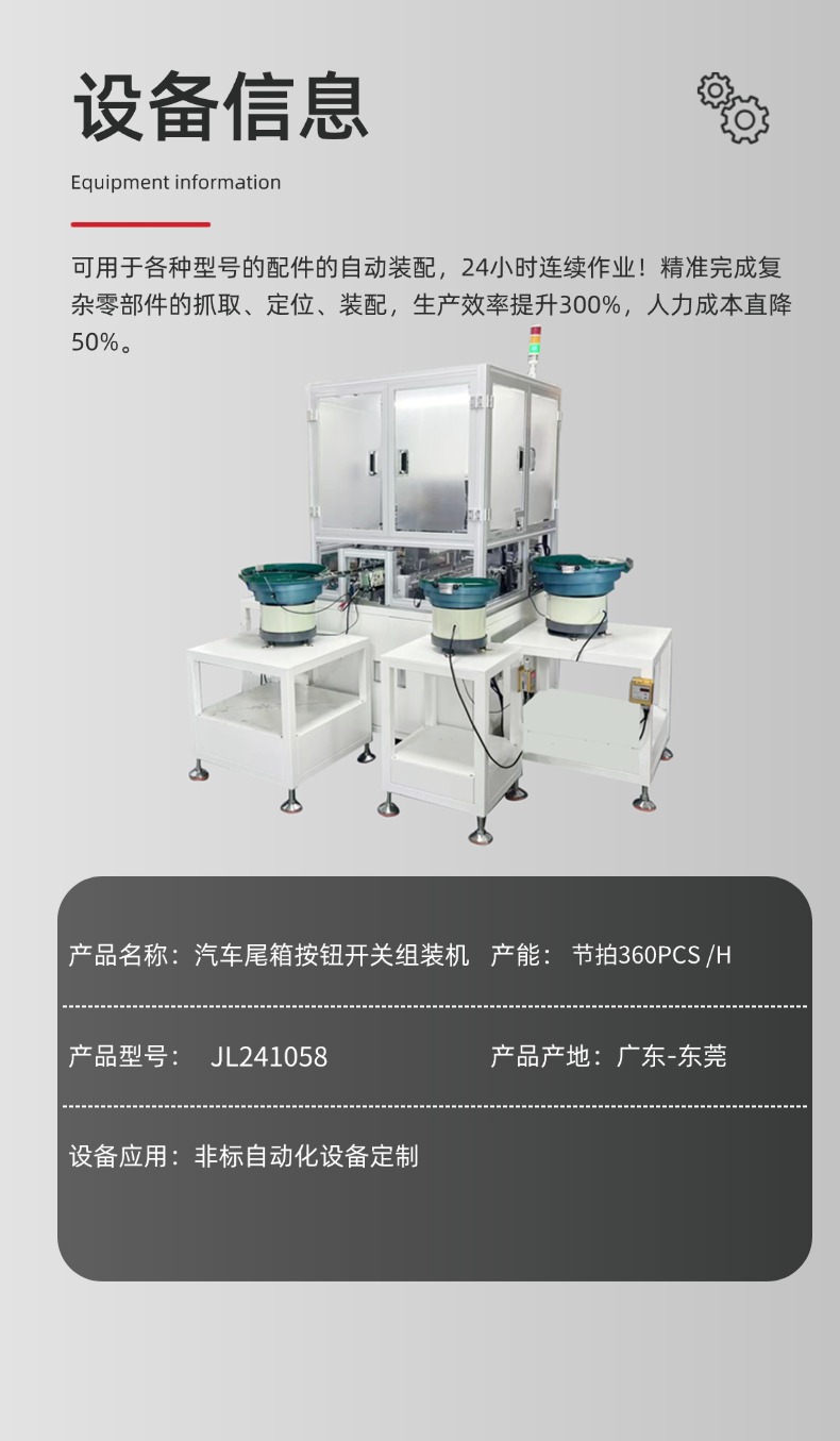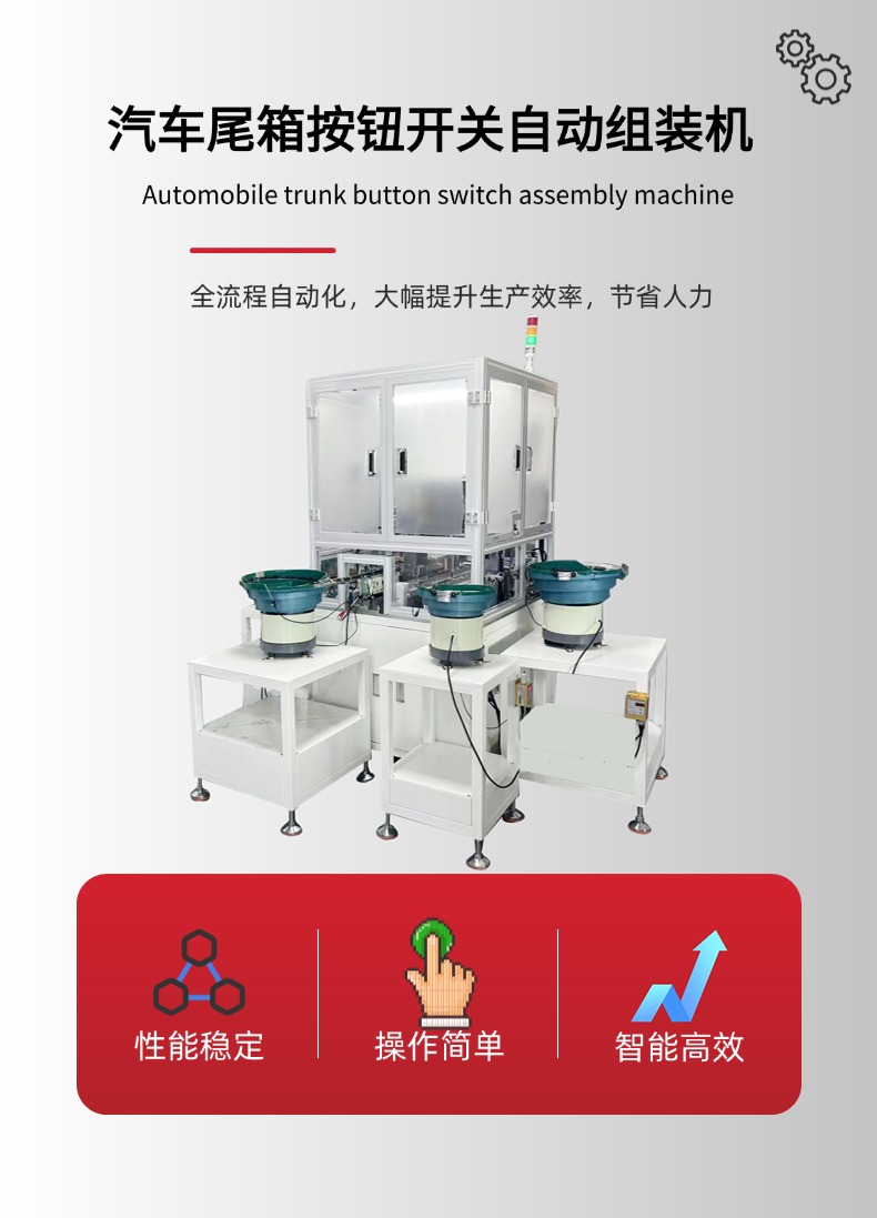 汽车尾箱按钮开关自动组装机是专门用于汽车尾箱开关自动化生产的设备,它通过精密的机械结构和智能控制系统,将多个零部件快速、准确地组装成完整产品。