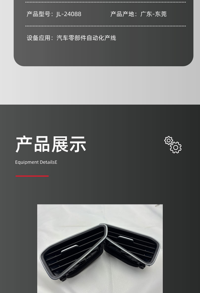 汽车出风口组装机是一款专为汽车内饰核心部件 —— 出风口总成打造的自动化智能装配设备,聚焦出风口叶片、拨轮、壳体、阻尼器、卡扣等多组件的精准组装需求。设备整合机械传动、视觉检测、气动控制等技术,实现从零部件上料、定位、压合、锁付到成品检测的全流程自动化作业,广泛适用于乘用车、商用车等不同车型的出风口批量生产,是汽车内饰件制造企业提升产能、保障品质的核心装备。